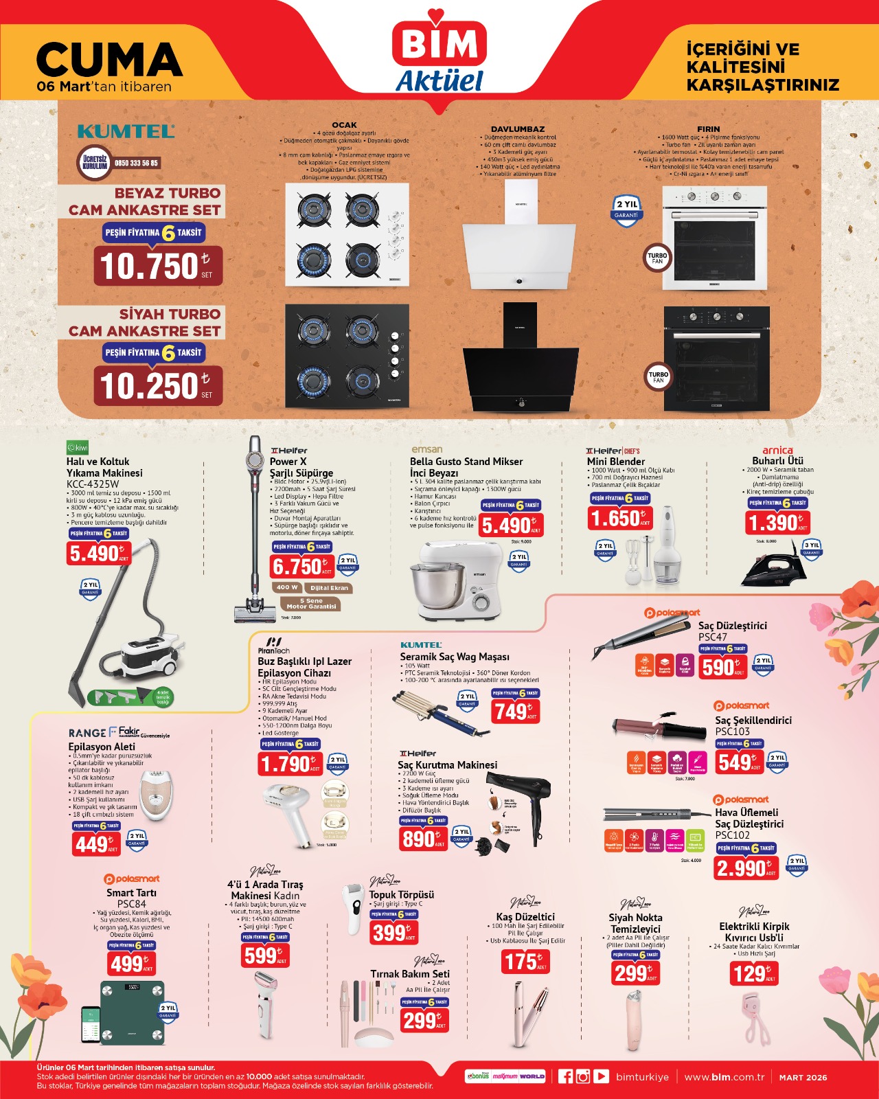Katalogda temizlik ürünlerinin yanı sıra mutfak ve kişisel bakım ürünleri de yer alıyor. Kumtel markalı ankastre setler, stand mikser ve küçük mutfak aletleri de kampanyanın öne çıkan ürünleri arasında bulunuyor.
