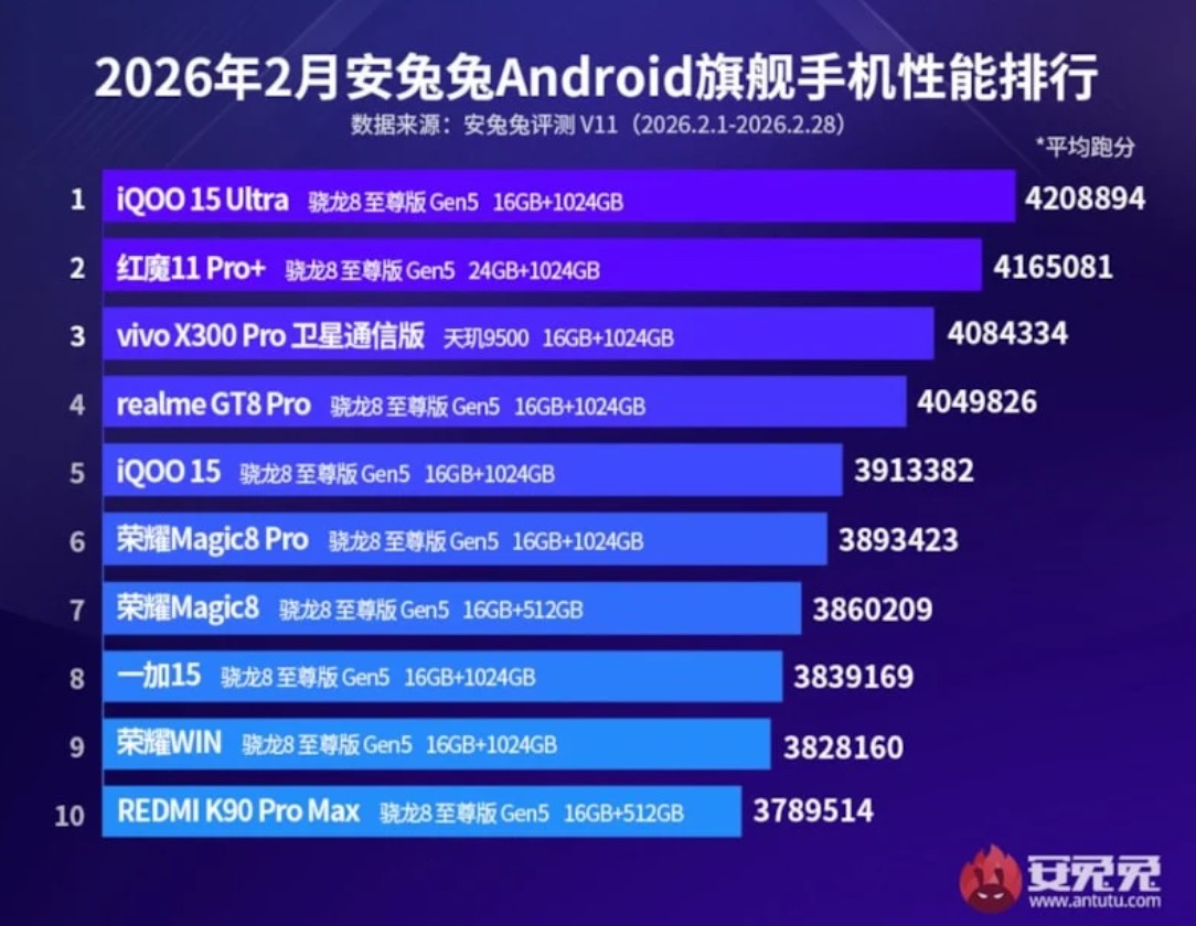 Şubat ayı verileri, mobil yonga seti rekabetinde Snapdragon ve MediaTek arasındaki uçurumun daraldığını ancak Qualcomm’un liderliğini sürdürdüğünü gösteriyor. Zirvenin sahibi iQOO 15 Ultra, 4.518.403 puanlık rekoruyla performans çıtasını ulaşılması güç bir noktaya taşırken; onu 4.16 milyon puanla oyuncu telefonu RedMagic 11 Pro+ ve 4.08 milyon puanla MediaTek Dimensity 9500 destekli Vivo X300 Pro takip etti. Özellikle uydu iletişimi ve gelişmiş soğutma sistemlerine sahip modellerin ilk 10’u domine etmesi, 2026 yılında “güç” kriterinin sadece hız değil, aynı zamanda teknolojik donanım çeşitliliğiyle ölçüldüğünü bir kez daha kanıtladı.